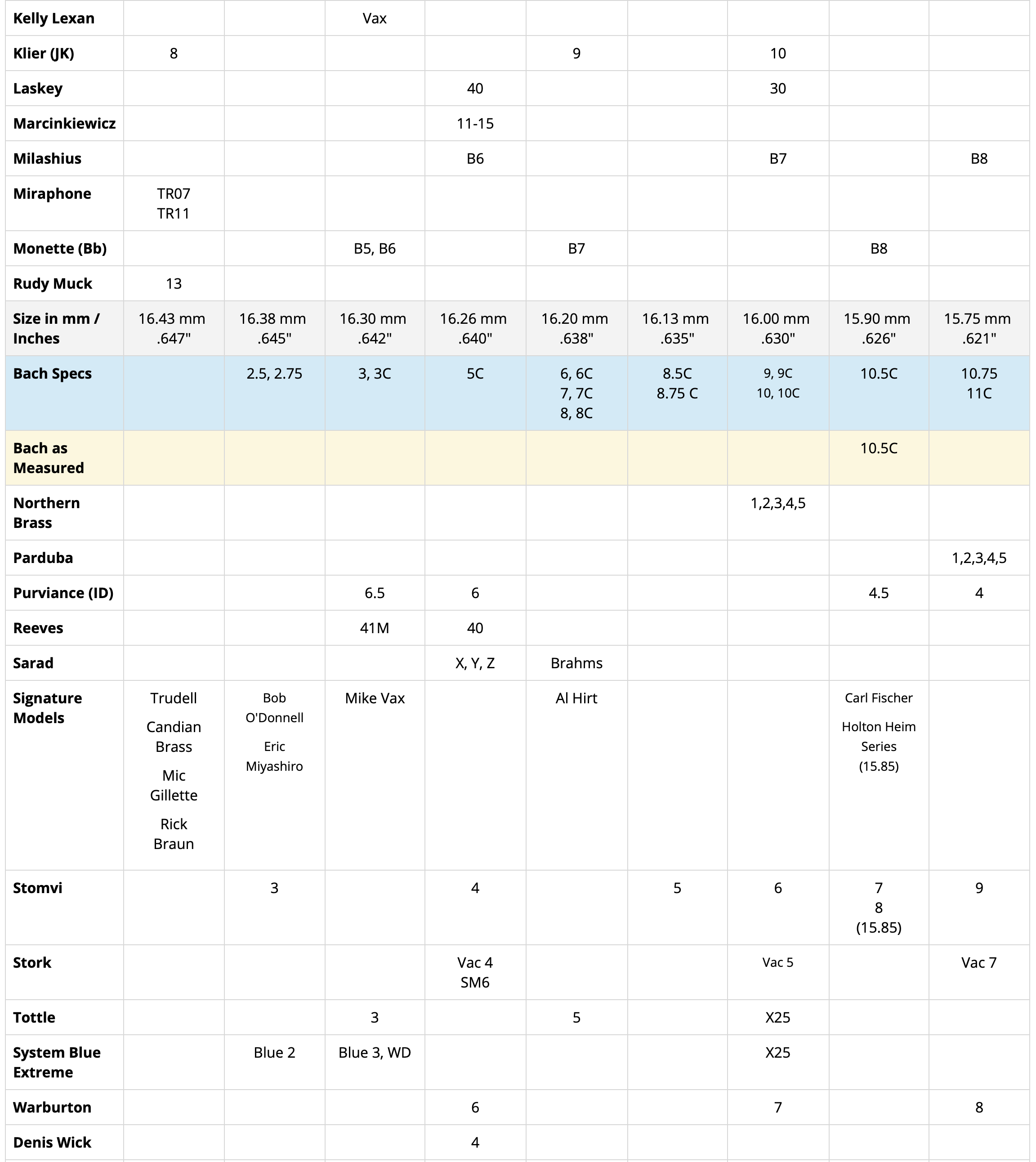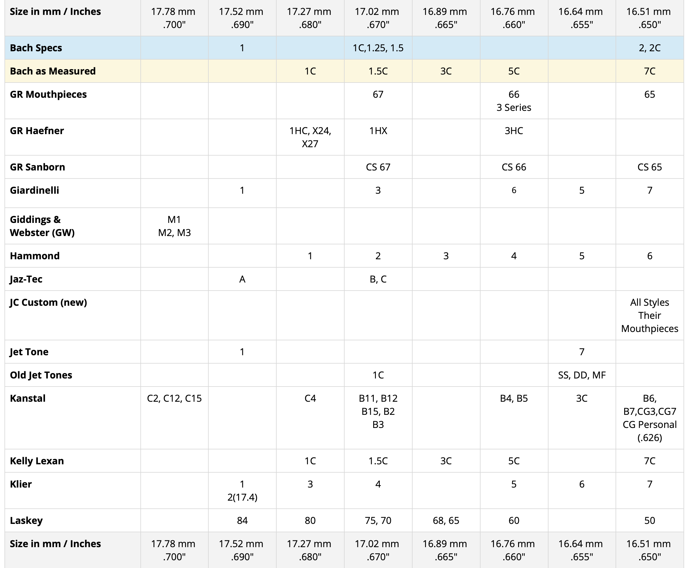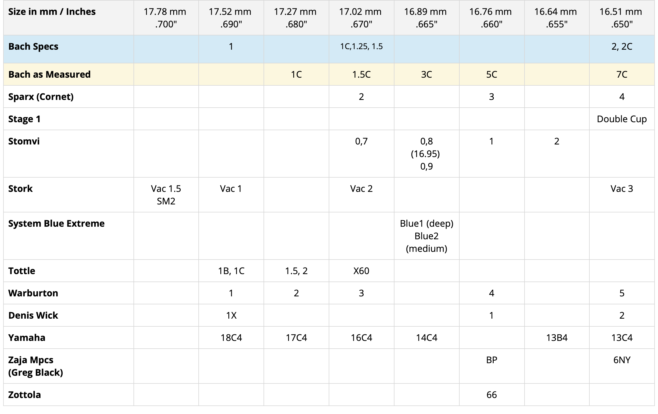 Please do not take diameter measurements too seriously. Most of the time the difference in columns can be 0.02 of an inch (0.5 mm). Not much really. The measurements are done for comparison purposes of relative sizes. Attributes such as cup depth, rim shape, bite, and backbore also make a big difference in how a mouthpiece plays and feels.