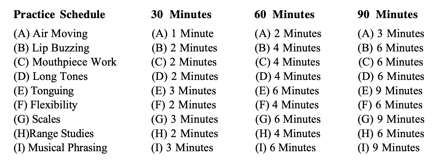 The warm up can also be adjusted to meet your various needs. You might have a weak area, and you may wish to increase time in that section. For example, your tone may be somewhat lacking in richness and warmth. As ALL sound is created through vibrations, your first method of attack would be to increase the minutes from the lip buzzing chapter until the desired results were achieved.