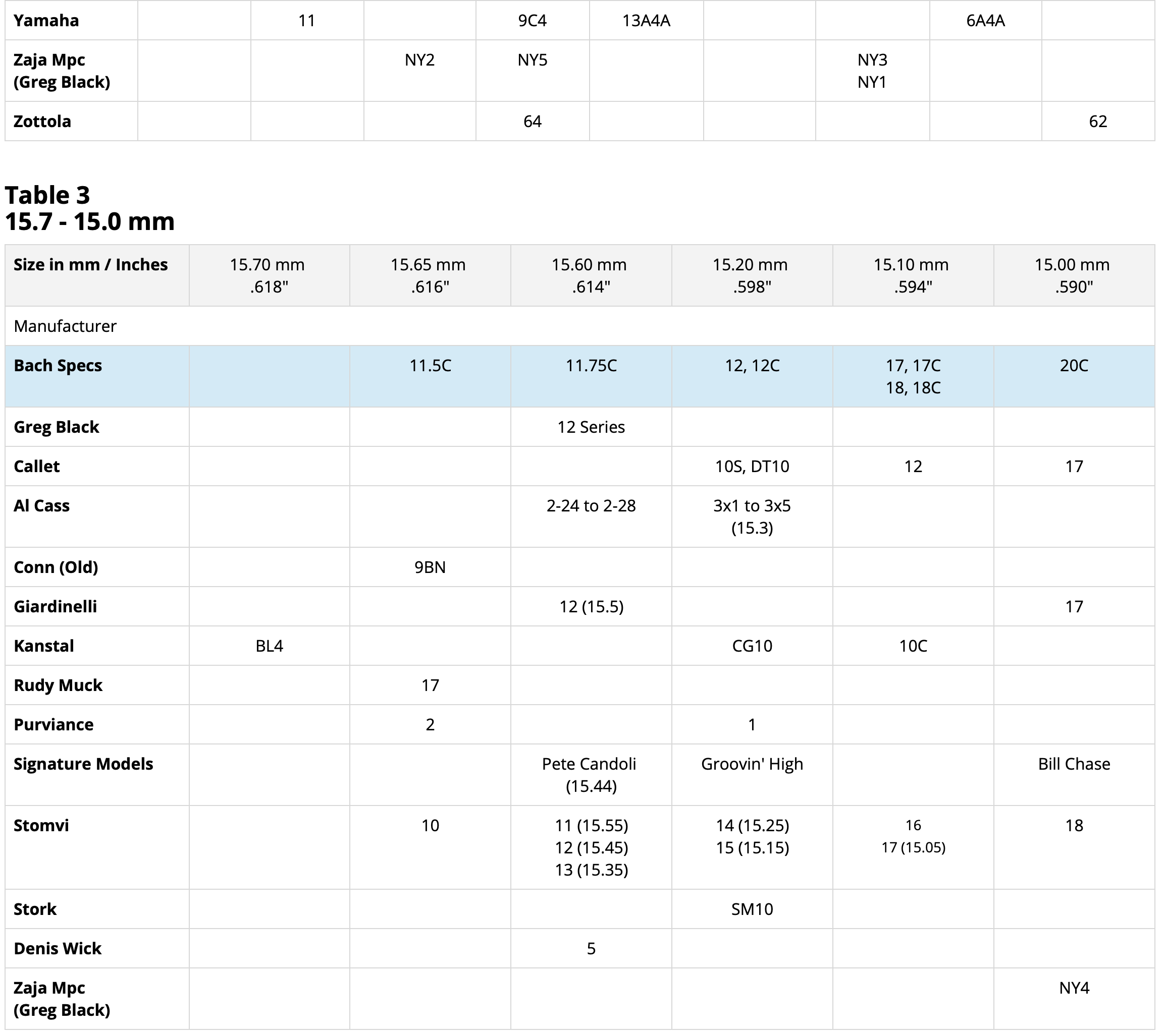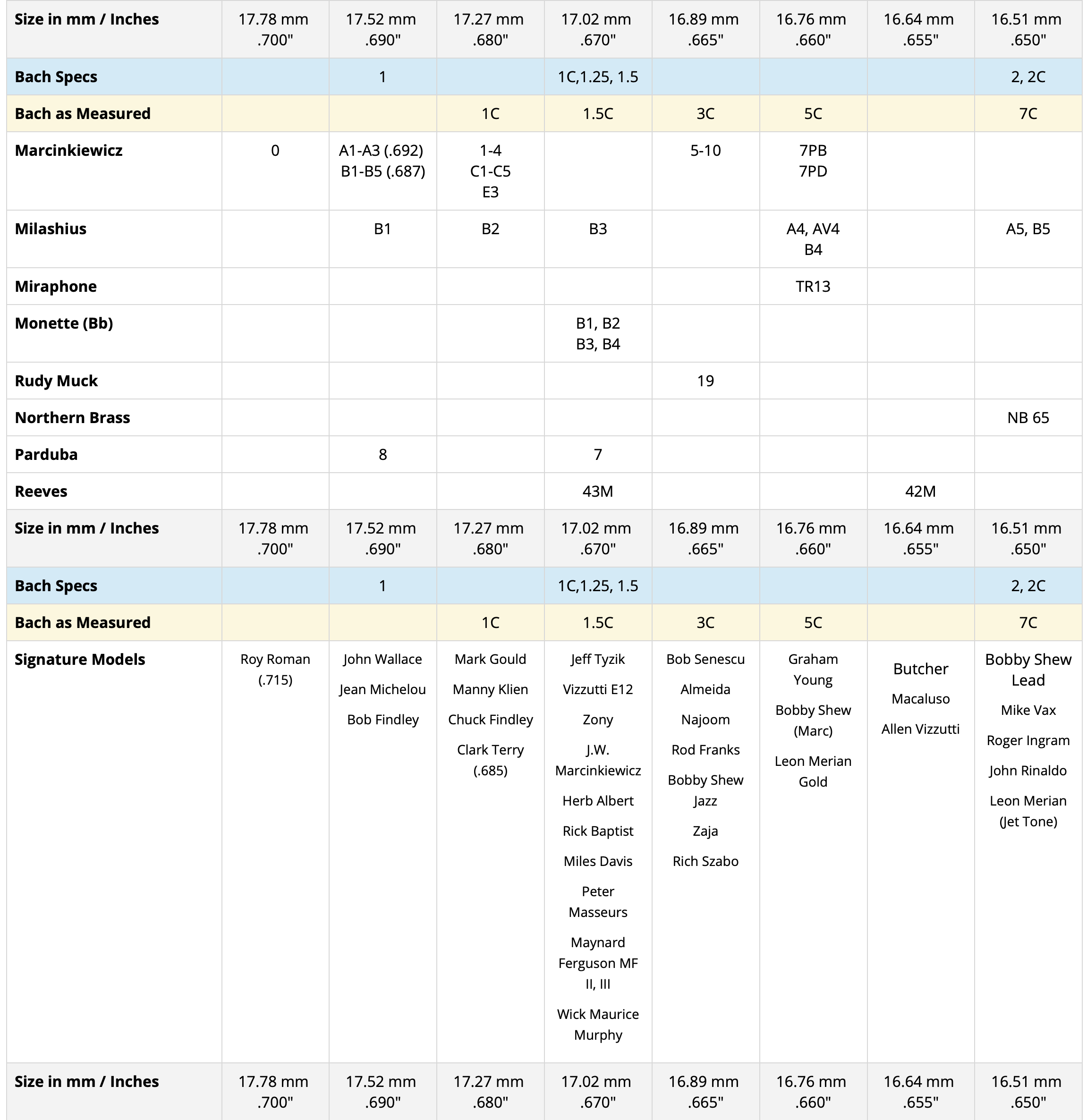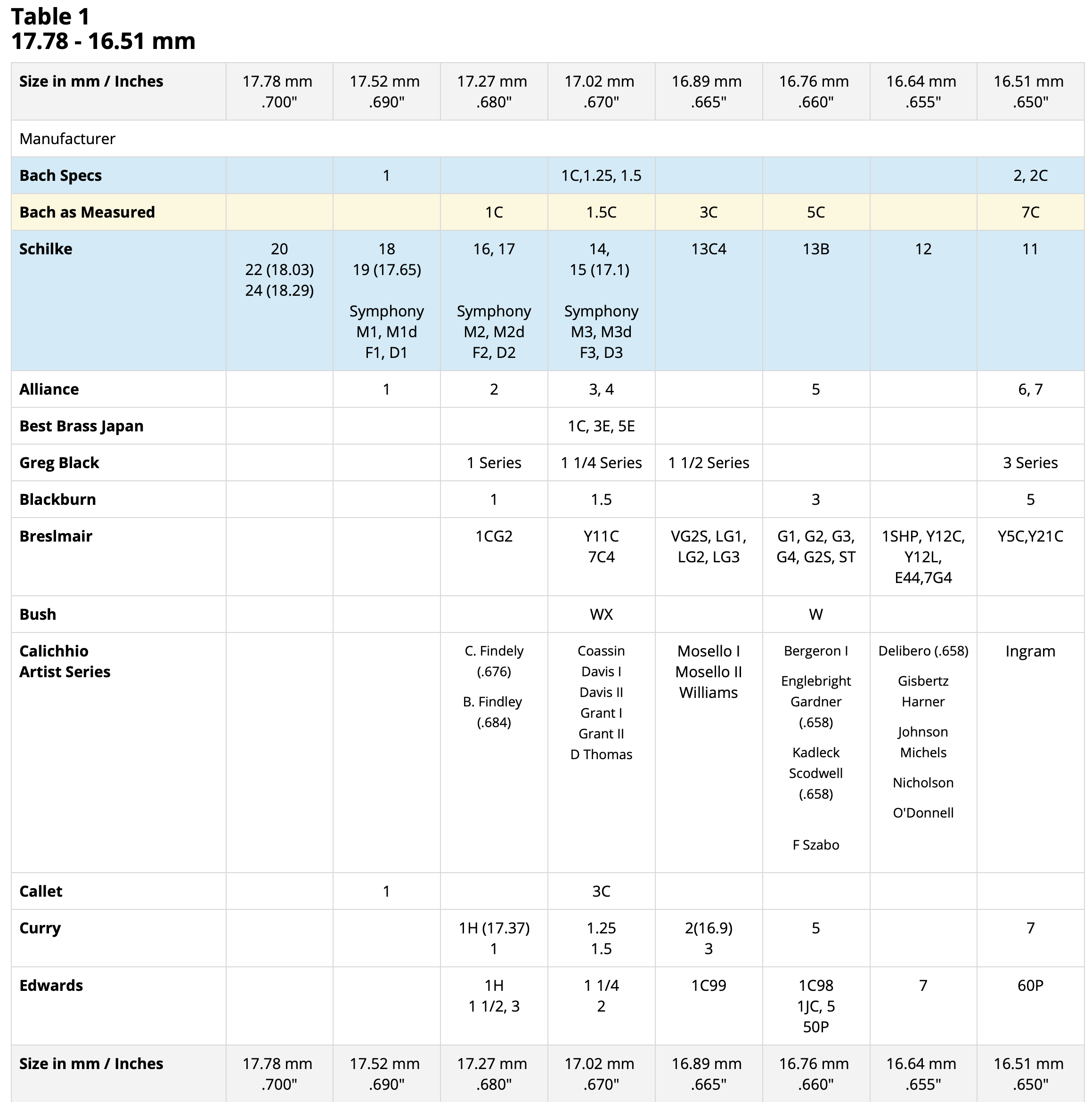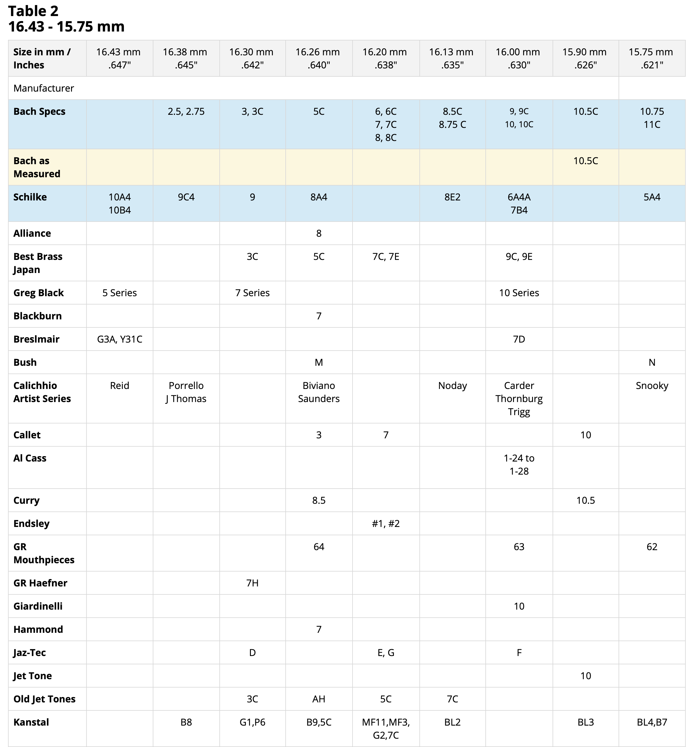 Please do not take diameter measurements too seriously. Most of the time the difference in columns can be 0.02 of an inch (0.5 mm). Not much really. The measurements are done for comparison purposes of relative sizes. Attributes such as cup depth, rim shape, bite, and backbore also make a big difference in how a mouthpiece plays and feels.